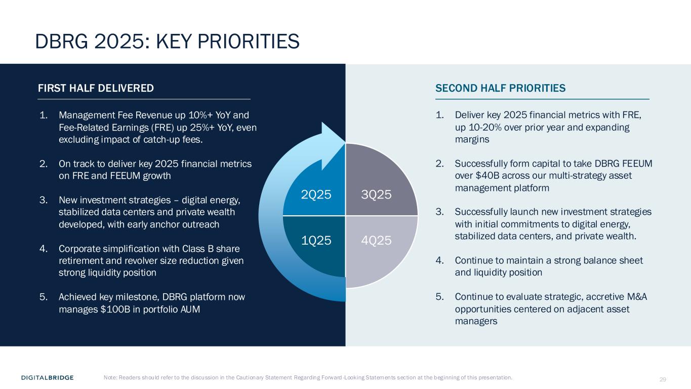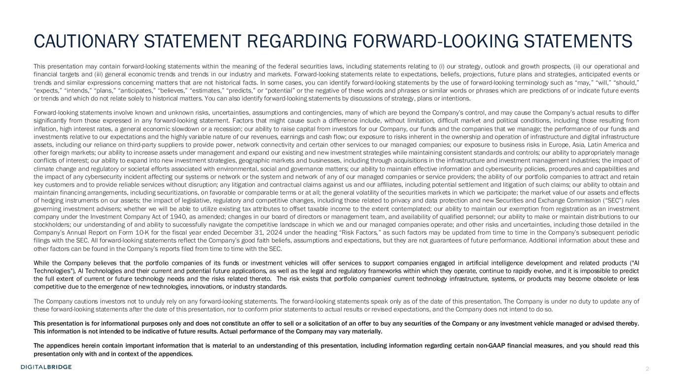 2 This presentation may contain forward-looking statements within the meaning of the federal securities laws, including statements relating to (i) our strategy, outlook and growth prospects, (ii) our operational and financial targets and (iii) general economic trends and trends in our industry and markets. Forward-looking statements relate to expectations, beliefs, projections, future plans and strategies, anticipated events or trends and similar expressions concerning matters that are not historical facts. In some cases, you can identify forward-looking statements by the use of forward-looking terminology such as “may,” “will,” “should,” “expects,” “intends,” “plans,” “anticipates,” “believes,” “estimates,” “predicts,” or “potential” or the negative of these words and phrases or similar words or phrases which are predictions of or indicate future events or trends and which do not relate solely to historical matters. You can also identify forward-looking statements by discussions of strategy, plans or intentions. Forward-looking statements involve known and unknown risks, uncertainties, assumptions and contingencies, many of which are beyond the Company’s control, and may cause the Company’s actual results to differ significantly from those expressed in any forward-looking statement. Factors that might cause such a difference include, without limitation, difficult market and political conditions, including those resulting from inflation, high interest rates, a general economic slowdown or a recession; our ability to raise capital from investors for our Company, our funds and the companies that we manage; the performance of our funds and investments relative to our expectations and the highly variable nature of our revenues, earnings and cash flow; our exposure to risks inherent in the ownership and operation of infrastructure and digital infrastructure assets, including our reliance on third-party suppliers to provide power, network connectivity and certain other services to our managed companies; our exposure to business risks in Europe, Asia, Latin America and other foreign markets; our ability to increase assets under management and expand our existing and new investment strategies while maintaining consistent standards and controls; our ability to appropriately manage conflicts of interest; our ability to expand into new investment strategies, geographic markets and businesses, including through acquisitions in the infrastructure and investment management industries; the impact of climate change and regulatory or societal efforts associated with environmental, social and governance matters; our ability to maintain effective information and cybersecurity policies, procedures and capabilities and the impact of any cybersecurity incident affecting our systems or network or the system and network of any of our managed companies or service providers; the ability of our portfolio companies to attract and retain key customers and to provide reliable services without disruption; any litigation and contractual claims against us and our affiliates, including potential settlement and litigation of such claims; our ability to obtain and maintain financing arrangements, including securitizations, on favorable or comparable terms or at all; the general volatility of the securities markets in which we participate; the market value of our assets and effects of hedging instruments on our assets; the impact of legislative, regulatory and competitive changes, including those related to privacy and data protection and new Securities and Exchange Commission (“SEC”) rules governing investment advisers; whether we will be able to utilize existing tax attributes to offset taxable income to the extent contemplated; our ability to maintain our exemption from registration as an investment company under the Investment Company Act of 1940, as amended; changes in our board of directors or management team, and availability of qualified personnel; our ability to make or maintain distributions to our stockholders; our understanding of and ability to successfully navigate the competitive landscape in which we and our managed companies operate; and other risks and uncertainties, including those detailed in the Company’s Annual Report on Form 10-K for the fiscal year ended December 31, 2024 under the heading “Risk Factors,” as such factors may be updated from time to time in the Company’s subsequent periodic filings with the SEC. All forward-looking statements reflect the Company’s good faith beliefs, assumptions and expectations, but they are not guarantees of future performance. Additional information about these and other factors can be found in the Company’s reports filed from time to time with the SEC. While the Company believes that the portfolio companies of its funds or investment vehicles will offer services to support companies engaged in artificial intelligence development and related products ("AI Technologies"), AI Technologies and their current and potential future applications, as well as the legal and regulatory frameworks within which they operate, continue to rapidly evolve, and it is impossible to predict the full extent of current or future technology needs and the risks related thereto. The risk exists that portfolio companies' current technology infrastructure, systems, or products may become obsolete or less competitive due to the emergence of new technologies, innovations, or industry standards. The Company cautions investors not to unduly rely on any forward-looking statements. The forward-looking statements speak only as of the date of this presentation. The Company is under no duty to update any of these forward-looking statements after the date of this presentation, nor to conform prior statements to actual results or revised expectations, and the Company does not intend to do so. This presentation is for informational purposes 