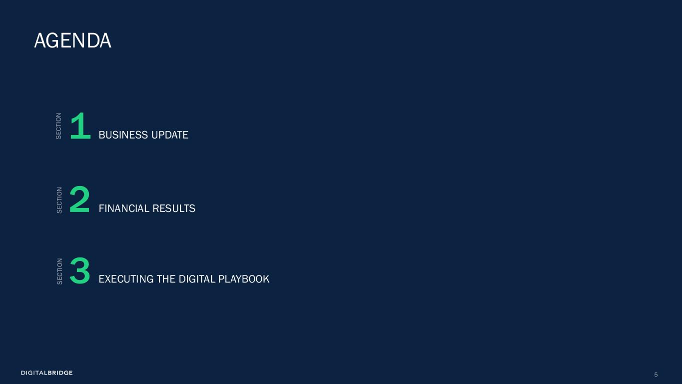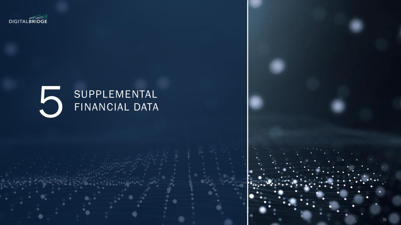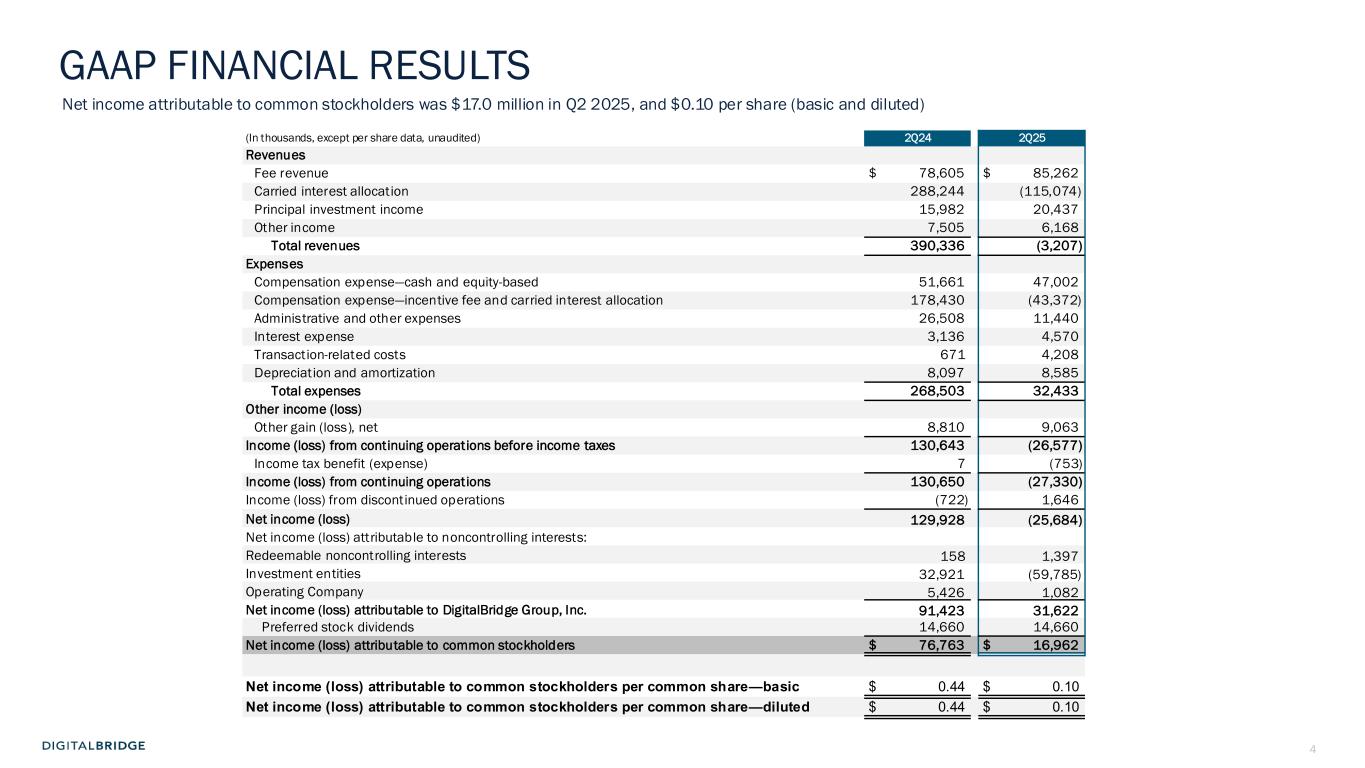 4 (In thousands, except per share data, unaudited) 2Q24 2Q25 Revenues Fee revenue $ 78,605 $ 85,262 Carried interest allocation 288,244 (115,074) Principal investment income 15,982 20,437 Other income 7,505 6,168 Total revenues 390,336 (3,207) Expenses Compensation expense—cash and equity-based 51,661 47,002 Compensation expense—incentive fee and carried interest allocation 178,430 (43,372) Administrative and other expenses 26,508 11,440 Interest expense 3,136 4,570 Transaction-related costs 671 4,208 Depreciation and amortization 8,097 8,585 Total expenses 268,503 32,433 Other income (loss) Other gain (loss), net 8,810 9,063 Income (loss) from continuing operations before income taxes 130,643 (26,577) Income tax benefit (expense) 7 (753) Income (loss) from continuing operations 130,650 (27,330) Income (loss) from discontinued operations (722) 1,646 Net income (loss) 129,928 (25,684) Net income (loss) attributable to noncontrolling interests: Redeemable noncontrolling interests 158 1,397 Investment entities 32,921 (59,785) Operating Company 5,426 1,082 Net income (loss) attributable to DigitalBridge Group, Inc. 91,423 31,622 Preferred stock dividends 14,660 14,660 Net income (loss) attributable to common stockholders $ 76,763 $ 16,962 Net income (loss) attributable to common stockholders per common share—basic $ 0.44 $ 0.10 Net income (loss) attributable to common stockholders per common share—diluted $ 0.44 $ 0.10 GAAP FINANCIAL RESULTS Net income attributable to common stockholders was $17.0 million in Q2 2025, and $0.10 per share (basic and diluted)