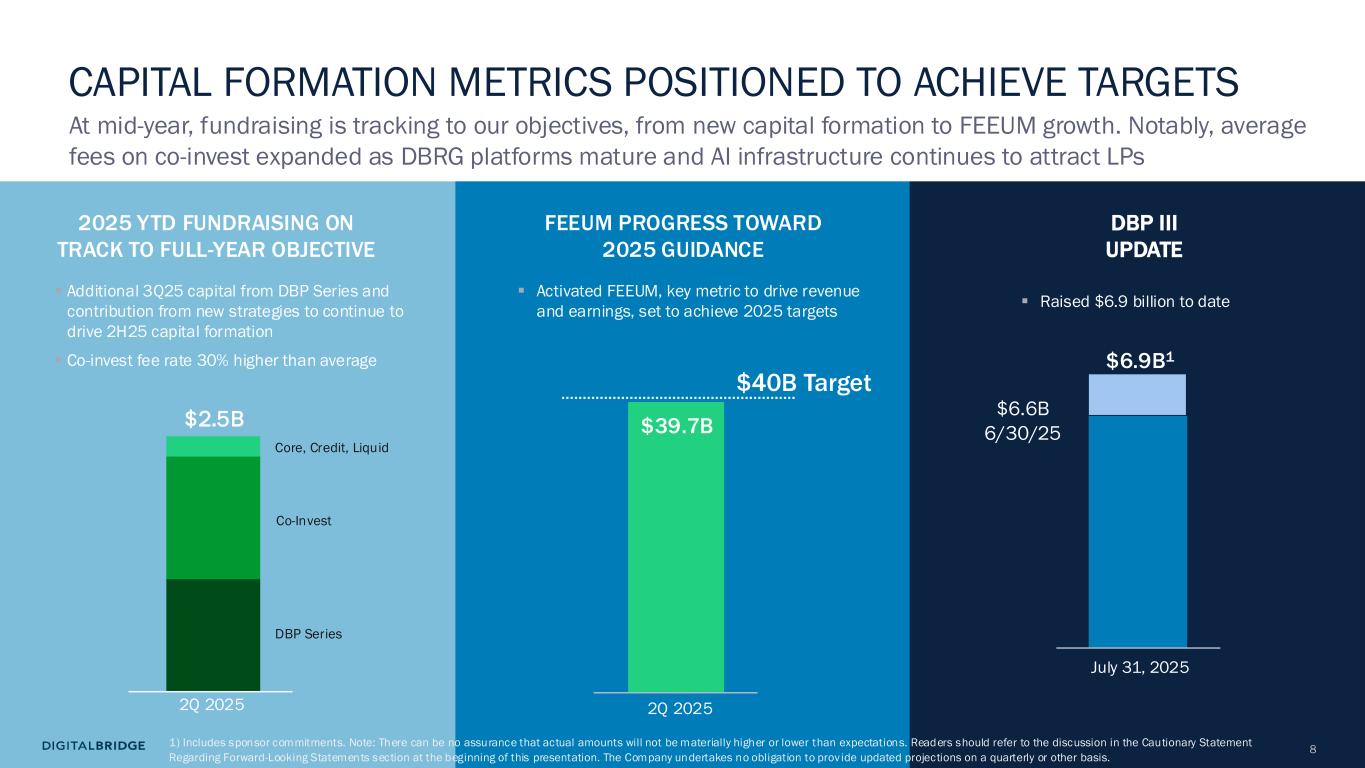 7 BUSINESS UPDATE Building AI factories, continuing to scale and power our leading data center footprint ▪ Closed on multi-billion Yondr data center acquisition, with 400MW+ in place and potential for 1GW+. ▪ Digital Energy investment in Takanock powered- land strategy in partnership with ArcLight. ▪ Significant financings at Switch and Vantage data center platforms to support strong bookings and significant capacity expansion. Solid Revenue and Earnings Growth Continues ▪ Fee Revenues of $85 million grew +8% YoY in 2Q25, supported by new FEEUM activation from the DBP Flagship series. ▪ Fee-Related Earnings (FRE) of $32 million grew +23% YoY in 2Q25. ▪ Continued margin improvement with revenues outpacing expenses, which were nearly flat YoY. $$$ In 2Q25, DBRG continued to deliver strong financial results and fundraising aligned with our objectives for the year, while continuing to scale our AI ecosystem footprint New capital formation of $2.5B YTD, $1.3B in 2Q, on track with 2025 targets INVESTSCALE FUNDRAISE INVEST FUNDRAISE SCALE - DBRG YTD 2025 $2.5 billion ▪ Well positioned entering historically strong 2H.