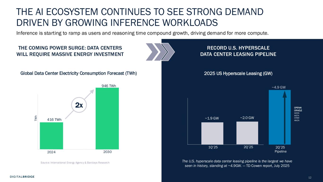 12 1Q’25 2Q’25 G W (C A P A C IT Y ) 2Q’25 Pipeline RECORD U.S. HYPERSCALE DATA CENTER LEASING PIPELINE The U.S. hyperscale data center leasing pipeline is the largest we have seen in history, standing at ~4.9GW. — TD Cowen report, July 2025 2025 US Hyperscale Leasing (GW) OPENAI ORACLE GOOG META CRWV AMZN ~2.0 GW ~4.9 GW ~1.9 GW THE COMING POWER SURGE: DATA CENTERS WILL REQUIRE MASSIVE ENERGY INVESTMENT 2024 2030 Source: International Energy Agency & Barclays Research T W h Global Data Center Electricity Consumption Forecast (TWh) 946 TWh 416 TWh THE AI ECOSYSTEM CONTINUES TO SEE STRONG DEMAND DRIVEN BY GROWING INFERENCE WORKLOADS Inference is starting to ramp as users and reasoning time compound growth, driving demand for more compute. 2x