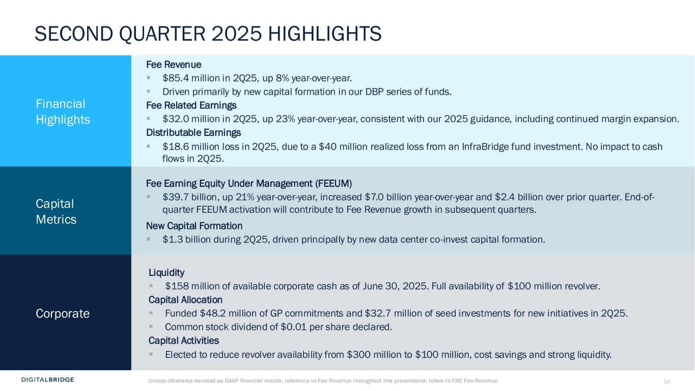 14 SECOND QUARTER 2025 HIGHLIGHTS Financial Highlights Fee Revenue ▪ $85.4 million in 2Q25, up 8% year-over-year. ▪ Driven primarily by new capital formation in our DBP series of funds. Fee Related Earnings ▪ $32.0 million in 2Q25, up 23% year-over-year, consistent with our 2025 guidance, including continued margin expansion. Distributable Earnings ▪ $18.6 million loss in 2Q25, due to a $40 million realized loss from an InfraBridge fund investment. No impact to cash flows in 2Q25. Capital Metrics Fee Earning Equity Under Management (FEEUM) ▪ $39.7 billion, up 21% year-over-year, increased $7.0 billion year-over-year and $2.4 billion over prior quarter. End-of- quarter FEEUM activation will contribute to Fee Revenue growth in subsequent quarters. New Capital Formation ▪ $1.3 billion during 2Q25, driven principally by new data center co-invest capital formation. Corporate Liquidity ▪ $158 million of available corporate cash as of June 30, 2025. Full availability of $100 million revolver. Capital Allocation ▪ Funded $48.2 million of GP commitments and $32.7 million of seed investments for new initiatives in 2Q25. ▪ Common stock dividend of $0.01 per share declared. Capital Activities ▪ Elected to reduce revolver availability from $300 million to $100 million, cost savings and strong liquidity. Unless otherwise denoted as GAAP financial results, reference to Fee Revenue throughout this presentation refers to FRE Fee Revenue.