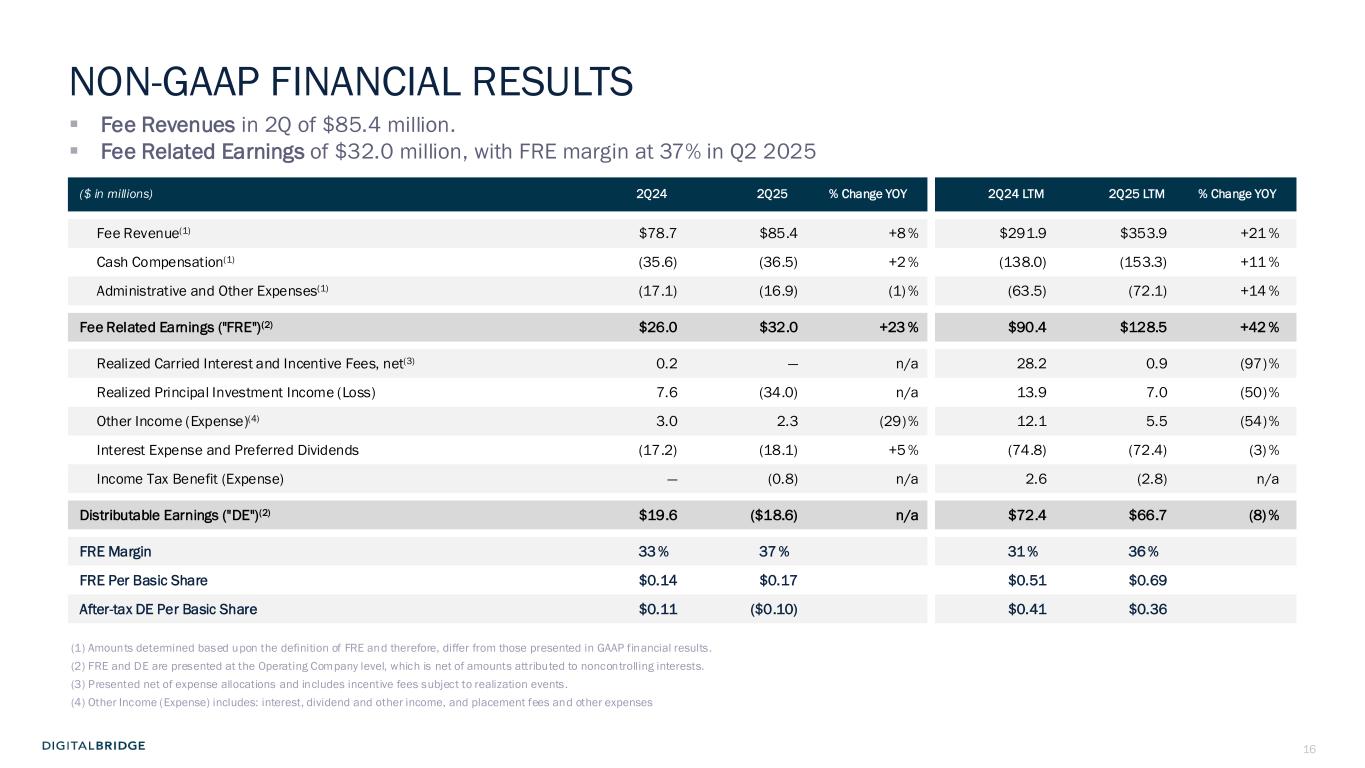 15 $0.7 $0.2 $0.3 $1.1 $0.1 FEEUM GROWTH DRIVEN BY ORGANIC FUNDRAISING Fee-Earning Equity Under Management (FEEUM) increased $7.0B, or 21% YoY, to $39.7B as of June 30, 2025, driven by organic capital formation from Co-Invest and the latest DBP flagship, offsetting a stepdown from “Committed” to “Invested” capital at InfraBridge. DBP Series Separately Capitalized PortcosCo-Invest NEW CAPITAL FORMATIONFEEUM InfraBridge Core, Liquid, Credit +21% YoY Growth ($ in Billions) ($ in Billions) (1) Inclusive of all capital committed to DigitalBridge managed investment vehicles, measured as of June 30, 2024 and June 30, 2025, respectively. 2Q25(1) $1.3 2Q24(1) $1.2 +17% 1Q25 2Q252Q24 $13.9 $16.7 $17.3 $9.5 $12.3 $14.8 $5.2 $3.7 $3.7 $1.2 $1.2 $1.2 $2.9 $3.4 $2.8 $32.7 $37.3 $39.7
