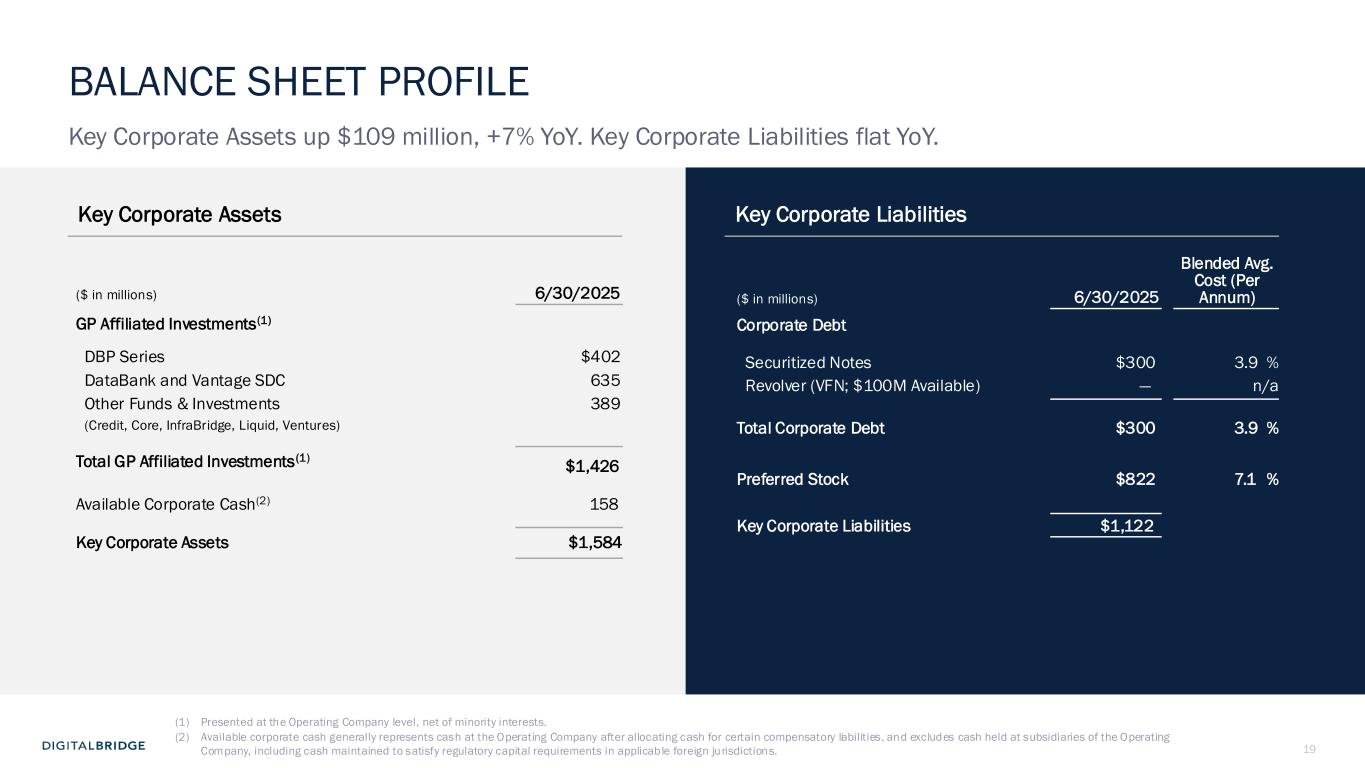 18 DBRG FINANCIAL PROFILE & FEEUM PROGRESSION Management Fee Revenue and FRE continue to step higher, driven by FEEUM growth on the back of new capital formation and FEEUM activation LTM Fee Revenue LTM FRE ($ in Billions) 3Q23 4Q23 1Q24 2Q24 3Q24 4Q24 1Q25 2Q25 Beginning Period Balance $29.1 $29.9 $32.8 $32.5 $32.7 $34.1 $35.5 $37.3 Inflows 1.1 4.1 1.4 1.2 1.6 3.2 2.0 3.4 Outflows/Realizations (0.2) (1.4) (1.6) (1.0) (0.3) (1.6) (0.3) (0.9) Market Activity (0.1) 0.1 (0.0) (0.1) 0.1 (0.1) 0.1 (0.1) End of Period Balance $29.9 $32.8 $32.5 $32.7 $34.1 $35.5 $37.3 $39.7 LTM Fee Revenue and FRE Profile(1) FEEUM Roll-forward (1) Latest twelve-month period calculated at Operating Company share. (2) Market activity includes changes in investment value based on NAV or GAV, and the effect of foreign exchange rates. $238M $267M $280M $292M $303M $330M $347M $354M $63M $82M $86M $90M $98M $107M $122M $129M 27% 31% 31% 31% 32% 32% 35% 36% 2Q251Q254Q243Q242Q241Q244Q233Q23