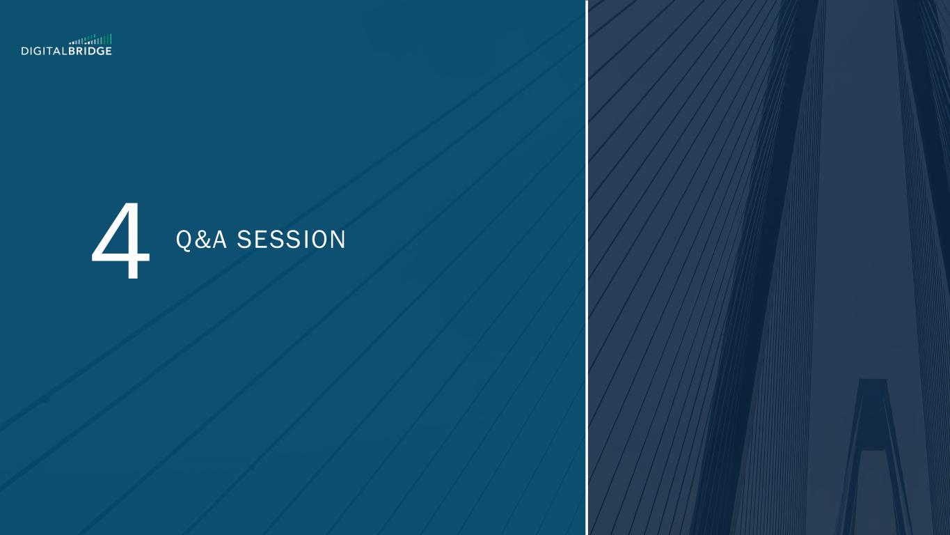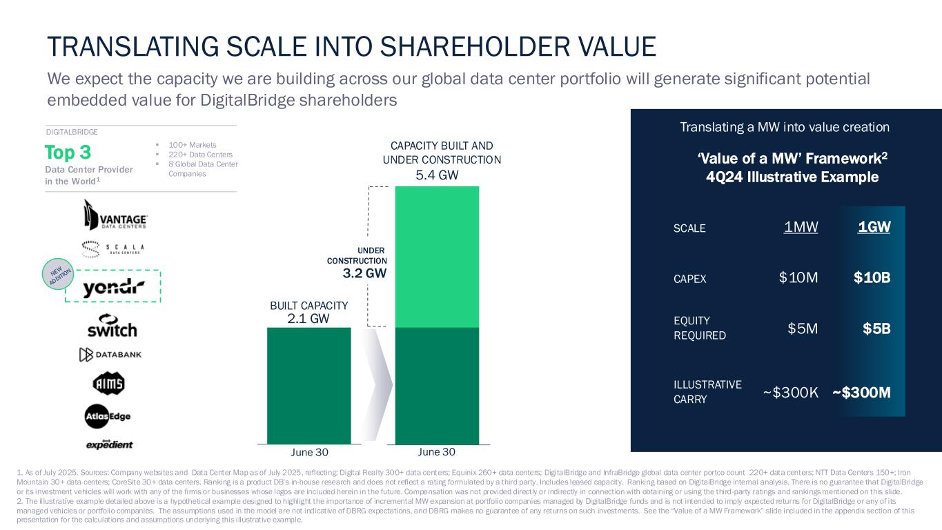 43 BaseCase Operation Capex per MW $10,000,000 a Equity Financing % 50% b Original Equity Invested $5,000,000 c (a*b) Pricing (Monthly $/Kw) $135.6 d Annual Revenue/MW $1,627,200 e (d*1,000*12) Incremental EBITDA Margin 50% f EBITDA/MW $813,600 g (e*f) EBITDA Multiple 20.0x h Market Value of Leased MW $16,272,000 i (g*h) Debt Repayment (principal+interest) $5,900,000 j ((a-c) + (a-c)*6%*3) Net Equity Value per MW $10,372,000 k (j-i) MOIC 2.1x l (k/c) Equity Profit per MW $5,372,000 m (k-c) Carry % (DBRG Profits Interest) 20% n Carry $ $1,074,400 o (m*n) DBRG Shareholder % of Carry 27% p DBRG Shareholder Value per MW $290,088 q (o*p) WHAT ABOUT A GIG? 1MW --> 1GW $290,088,000 r (q X 1,000) # of Shares (millions) 187.0 s DBRG $ Value/Share/GW $1.55 t (s/r) UNDERSTANDING THE VALUE OF A MW TO DBRG SHAREHOLDER Megawatts, Gigawatts…what does it mean to the DBRG shareholder?…our investments create embedded value. Simple analysis, using market- based assumptions, suggests substantial value creation for DBRG shareholders via carried interest… …$290K/MW turns into $290M in potential DBRG shareholder carry when you are building at Gigawatt scale like some of our platforms…representing potentially over $1.50 of value per share per GW. 1 Pricing assumes 50% Hyperscale @~$115/kw/mth, 25% enterprise @~180/kw/mth and 25% wholesale @~$130/kw/mth ; CBRE, GreenStreet, DBRG 2 Simple interest accrues @ 6% over 3 year build out and lease up period 3 Represents average DBRG flagship carried interest % 4 Represents blended average DBRG shareholder % of carried interest,~25% historical, 40% go -forward, per DBRG 2024 Investor Day 1 2 4 3 Illustrative Example Original Equity Invested of $5 million/MW turns into Net Equity Value of $10.4 million/MW by Year 3 Value creation accrues to DBRG shareholders via participation in carried interest At GW scale, significant potential for value creation Notably, analysis utilizes conservative incremental margins Note: The illustrative example detailed above is a hypothetical example designed to highlight the importance of incremental MW expansion at portfolio companies managed by DigitalBridge funds and is not intended to imply expected returns for DigitalBridge or any of its managed vehicles or portfolio companies. The assumptions used in the model are not indicative ofDBRG expectations, and DBRG makes no guarantee of any returns on such investments. Originally presented in 4Q24 Earnings Presentation