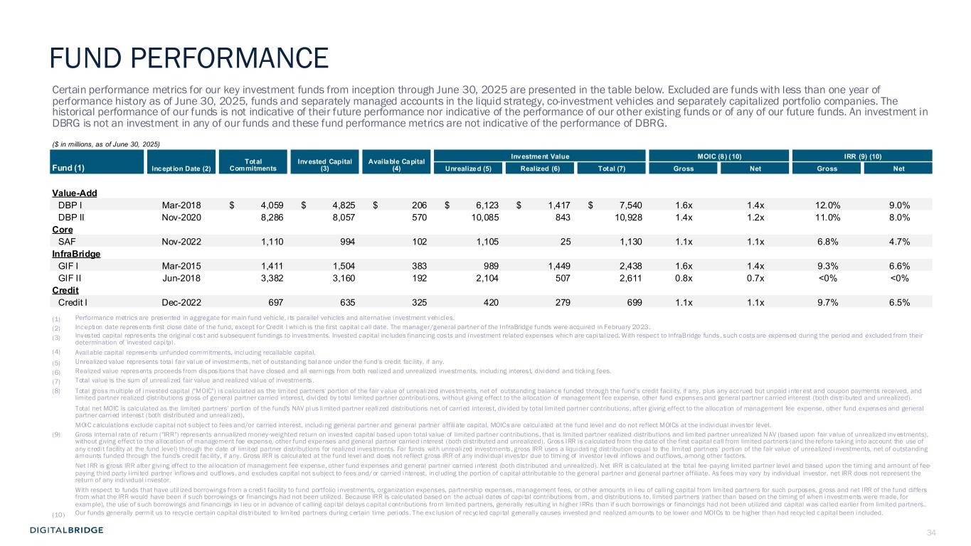 34 Certain performance metrics for our key investment funds from inception through June 30, 2025 are presented in the table below. Excluded are funds with less than one year of performance history as of June 30, 2025, funds and separately managed accounts in the liquid strategy, co-investment vehicles and separately capitalized portfolio companies. The historical performance of our funds is not indicative of their future performance nor indicative of the performance of our other existing funds or of any of our future funds. An investment in DBRG is not an investment in any of our funds and these fund performance metrics are not indicative of the performance of DBRG. ($ in millions, as of June 30, 2025) Incept ion Date (2) Total Commitments Invested Capital (3) Available Capital (4) Investment Value MOIC (8) (10) IRR (9) (10) Fund (1) Unrealized (5) Realized (6) Total (7) Gross Net Gross Net Value-Add DBP I Mar-2018 $ 4,059 $ 4,825 $ 206 $ 6,123 $ 1,417 $ 7,540 1.6x 1.4x 12.0% 9.0% DBP II Nov-2020 8,286 8,057 570 10,085 843 10,928 1.4x 1.2x 11.0% 8.0% Core SAF Nov-2022 1,110 994 102 1,105 25 1,130 1.1x 1.1x 6.8% 4.7% InfraBridge GIF I Mar-2015 1,411 1,504 383 989 1,449 2,438 1.6x 1.4x 9.3% 6.6% GIF II Jun-2018 3,382 3,160 192 2,104 507 2,611 0.8x 0.7x <0% <0% Credit Credit I Dec-2022 697 635 325 420 279 699 1.1x 1.1x 9.7% 6.5% (1) Performance metrics are presented in aggregate for main fund vehicle, i ts parallel vehicles and alternative investment vehicles. (2) Inception date represents first close date of the fund, except for Credit I which is the first capital call date. The manager/general partner of the InfraBridge funds were acquired in February 2023. (3) Invested capital represents the original cost and subsequent fundings to investments. Invested capital includes financing costs and investment related expenses which are capi tal ized. With respect to InfraBridge funds, such costs are expensed during the period and excluded from their determination of invested capi tal . (4) Available capital represents unfunded commitments, including recallable capital. (5) Unrealized value represents total fair value of investments, net of outstanding balance under the fund’s credit facility, if any. (6) Realized value represents proceeds from dispositions that have closed and all earnings from both real ized and unrealized investments, including interest, dividend and ticking fees. (7) Total value is the sum of unrealized fair value and realized value of investments. (8) Total gross multiple of invested capital ("MOIC") is calculated as the limited partners' portion of the fair value of unreali zed investments, net of outstanding balance funded through the fund's credit facil ity, if any, plus any accrued but unpaid inter est and coupon payments received, and limited partner realized distributions gross of general partner carried interest, divided by total limited partner contributions, without giving effect to the allocation of management fee expense, other fund expenses and general partner carried interest (both distributed and unrealized). Total net MOIC is calculated as the limited partners' portion of the fund's NAV plus limited partner realized distributions net of carried interest, div ided by total limited partner contributions, after giving effect to the allocation of management fee expense, other fund expenses and general partner carried interest (both distributed and unrealized). MOIC calculations exclude capital not subject to fees and/or carried interest, including general partner and general partner affiliate capital. MOICs are calculated at the fund level and do not reflect MOICs at the individual investor level. (9) Gross internal rate of return ("IRR") represents annualized money-weighted return on invested capital based upon total value of limited partner contributions, that is limited partner realized distributions and limited partner unrealized NAV (based upon fair value of unrealized investments), without giving effect to the allocation of management fee expense, other fund expenses and general partner carried interest (both distributed and unrealized). Gross IRR is calculated from the date of the first capital call from limited partners (and the refore taking into account the use of any credi t facility at the fund level) through the date of limited partner distributions for realized investments. For funds with unrealized investments, gross IRR uses a liquidating distribution equal to the limited partners' portion of the fair value of unrealized investments, net of outstanding amounts funded through the fund's credit facility, if any. Gross IRR is calculated at the fund level and does not reflect gross IRR of any individual investor due to timing of investor level inflows and outflows, among other factors. Net IRR is gross IRR after giving effect to the al location of management fee expense, other fund expenses and general partner carried interest (both distributed and unrealized). Net IRR is calculated at the total fee -paying limited partner level and based upon the timing and amount of fee- paying third party l imited partner inflows and outflows, and excludes capital not subject to fees and/or carried interest, in cluding the portion of capital attributable to the general partner and general partner affiliate. As fees may vary by individual investor, net IRR does not represent the return of any individual investor. With respect to funds that have util ized borrowings from a credi t facility to fund portfolio investments, organization expenses, partnership expenses, management fees, or other amounts in lieu of calling capital from limited partners for such purposes, gross and net IRR of the fund differs from what the IRR would have been if such borrowings or financings had not been utilized. Because IRR is calculated based on the actual dates of capi tal contributions from, and distributions to, limited partners (rather than based on the timing of when i nvestments wer