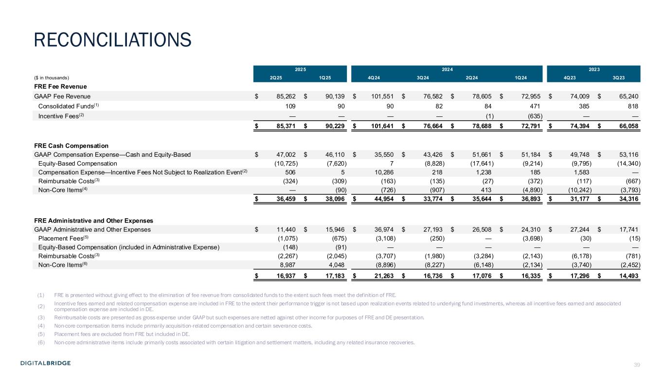 39 2025 2024 2023 ($ in thousands) 2Q25 1Q25 4Q24 3Q24 2Q24 1Q24 4Q23 3Q23 FRE Fee Revenue GAAP Fee Revenue $ 85,262 $ 90,139 $ 101,551 $ 76,582 $ 78,605 $ 72,955 $ 74,009 $ 65,240 Consolidated Funds(1) 109 90 90 82 84 471 385 818 Incentive Fees(2) — — — — (1) (635) — — $ 85,371 $ 90,229 $ 101,641 $ 76,664 $ 78,688 $ 72,791 $ 74,394 $ 66,058 FRE Cash Compensation GAAP Compensation Expense—Cash and Equity-Based $ 47,002 $ 46,110 $ 35,550 $ 43,426 $ 51,661 $ 51,184 $ 49,748 $ 53,116 Equity-Based Compensation (10,725) (7,620) 7 (8,828) (17,641) (9,214) (9,795) (14,340) Compensation Expense—Incentive Fees Not Subject to Realization Event(2) 506 5 10,286 218 1,238 185 1,583 — Reimbursable Costs(3) (324) (309) (163) (135) (27) (372) (117) (667) Non-Core Items(4) — (90) (726) (907) 413 (4,890) (10,242) (3,793) $ 36,459 $ 38,096 $ 44,954 $ 33,774 $ 35,644 $ 36,893 $ 31,177 $ 34,316 FRE Administrative and Other Expenses GAAP Administrative and Other Expenses $ 11,440 $ 15,946 $ 36,974 $ 27,193 $ 26,508 $ 24,310 $ 27,244 $ 17,741 Placement Fees(5) (1,075) (675) (3,108) (250) — (3,698) (30) (15) Equity-Based Compensation (included in Administrative Expense) (148) (91) — — — — — — Reimbursable Costs(3) (2,267) (2,045) (3,707) (1,980) (3,284) (2,143) (6,178) (781) Non-Core Items(6) 8,987 4,048 (8,896) (8,227) (6,148) (2,134) (3,740) (2,452) $ 16,937 $ 17,183 $ 21,263 $ 16,736 $ 17,076 $ 16,335 $ 17,296 $ 14,493 (1) FRE is presented without giving effect to the elimination of fee revenue from consolidated funds to the extent such fees meet the definition of FRE. (2) Incentive fees earned and related compensation expense are included in FRE to the extent their performance trigger is not based upon realization events related to underlying fund investments, whereas all incentive fees earned and associated compensation expense are included in DE. (3) Reimbursable costs are presented as gross expense under GAAP but such expenses are netted against other income for purposes of FRE and DE presentation. (4) Non-core compensation items include primarily acquisition-related compensation and certain severance costs. (5) Placement fees are excluded from FRE but included in DE. (6) Non-core administrative items include primarily costs associated with certain litigation and settlement matters, including any related insurance recoveries. RECONCILIATIONS